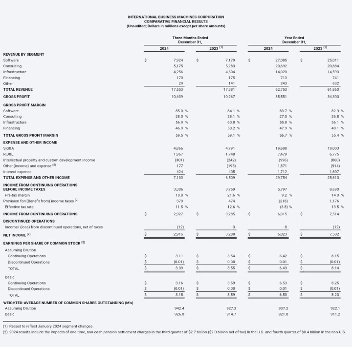 三言科技1月30日音问,IBM今天发布了该公司的2024财年第四季度及全年财报。求教显现,IBM第四季度营收为175.53亿好意思元,与上年同时的173.81亿好意思元比较增长1%,不计入汇率变动的影响为同比增长2%;来自于执续运贸易务的净利润为29.27亿好意思元开云体育,与上年同时的32.85亿好意思元比较下跌11%;不按照好意思国通用司帐准则,来自于执续运贸易务的运营净利润为37亿好意思元,同比增长3%。